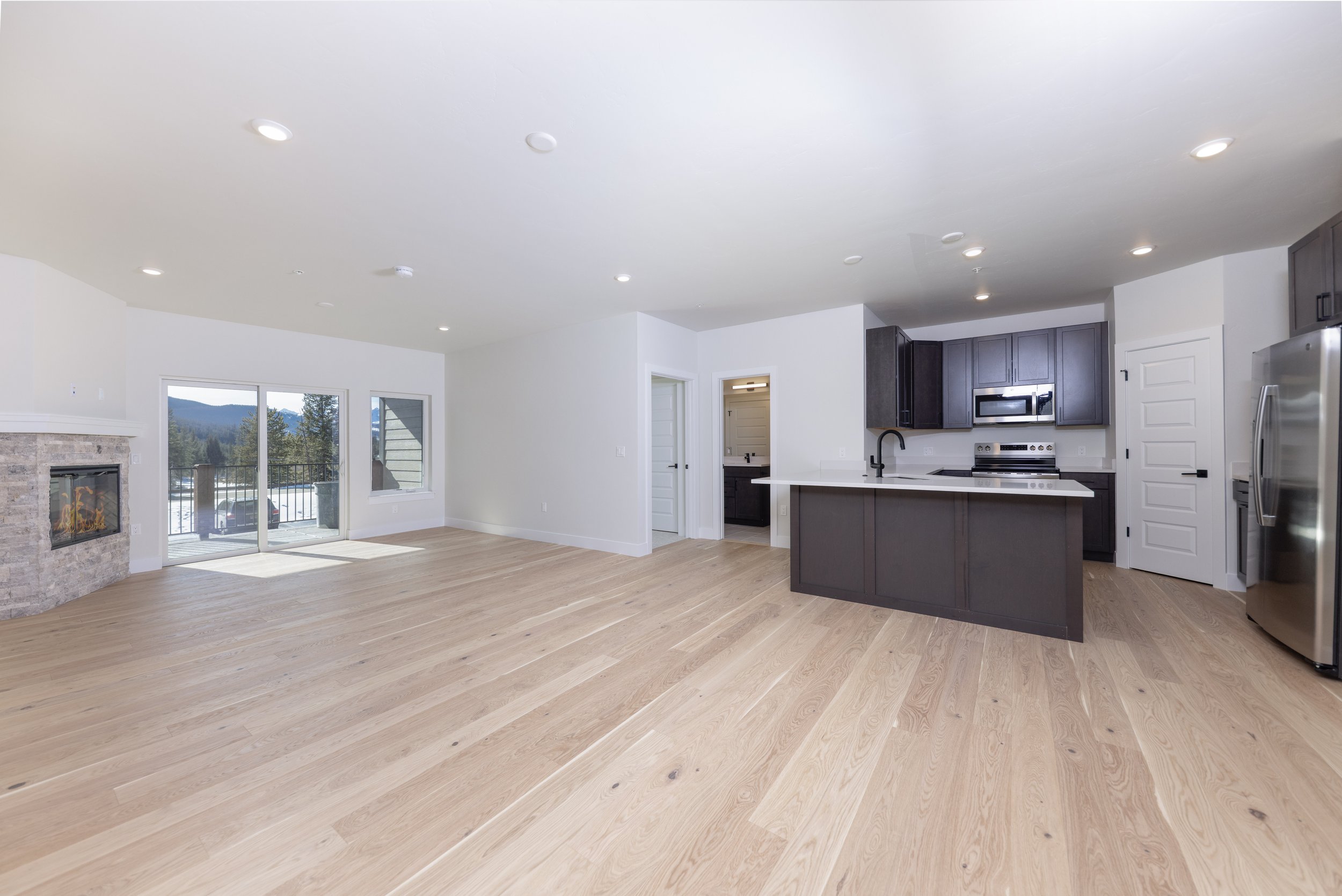 Under-construction multi-story apartment complex with new roofing, surrounded by a scenic mountain landscape with a flowing river and lush green trees.